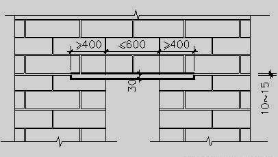 3.6.7 洞頂未設(shè)置主體結(jié)構(gòu)水平構(gòu)件處,當(dāng)洞頂凈寬大于0.6m但不大于2m時(shí),宜在洞頂處設(shè)置預(yù)制或現(xiàn)澆C20的鋼筋混凝土過梁。過梁的截面尺寸及配筋按設(shè)計(jì)計(jì)算確定,混凝土強(qiáng)度等級(jí)不宜低于C20,兩端伸進(jìn)砌體內(nèi)各不小于0.4m,如圖3.6.7所示: