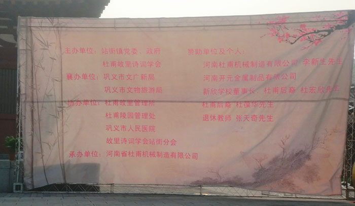 2014年4月4日清晨,由我公司-河南省杜甫機(jī)械制造有限公司為承辦單位的“第二屆清明文化節(jié)祭拜詩圣杜甫典禮”在鞏義市站街鎮(zhèn)杜甫故里紀(jì)念館中隆重舉行。此次祭拜詩圣典禮是繼2013年后的第二屆祭拜詩圣活動(dòng)。是由站街鎮(zhèn)黨委、政府以及杜甫故里詩詞學(xué)會主辦,杜甫故里管理所等單位協(xié)辦的。