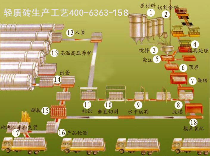 (1)原料貯備倉(cāng)→(2)計(jì)量配料→(3)原料加水混合攪拌→(4)模具準(zhǔn)備→(5)澆注→(6)發(fā)氣靜?!?/span>7)脫模→(8)翻轉(zhuǎn),水平切割、垂直切割→(9)編組入釜→(10)高溫高壓養(yǎng)護(hù)→(11)成品出釜→(12)檢驗(yàn)成品→(13)碼垛貯存→(14)出廠